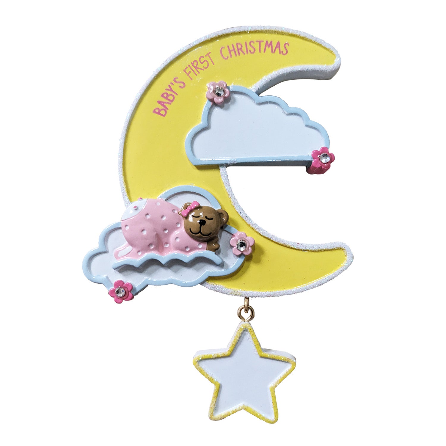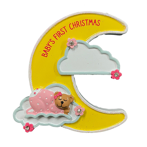 Celebrate your newest arrival with one of our most popular designs—this sweet ornament captures the magic of baby’s first Christmas under a glittering crescent moon. Featuring a peaceful teddy bear swaddled in a pink polka dot blanket, this ornament is the perfect keepsake for new parents and growing families.