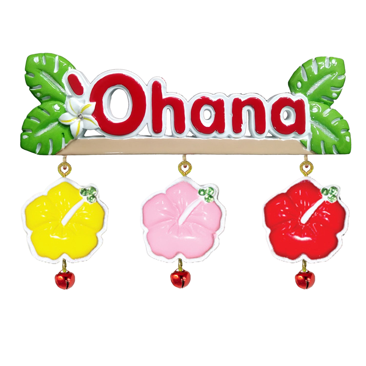 Celebrate what matters most with this ʻOhana Linking Ornament! Featuring bright red lettering framed by tropical monstera leaves, a white plumeria flower, and festive red jingle bells, this ornament honors the Hawaiian value of ohana — meaning family, chosen or given.
