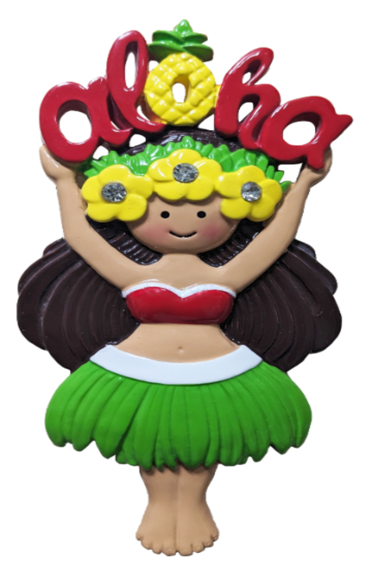 Celebrate the warmth and spirit of Hawai‘i with our vibrant Aloha Hula Girl Ornament, a tropical holiday favorite for over a decade! This cheerful hula dancer is dressed in a classic red bandeau top and green grass skirt, crowned with a yellow plumeria flower lei and sparkling rhinestones. She proudly holds a bold “aloha” sign accented with a pineapple — the ultimate symbol of hospitality and Hawaiian charm.