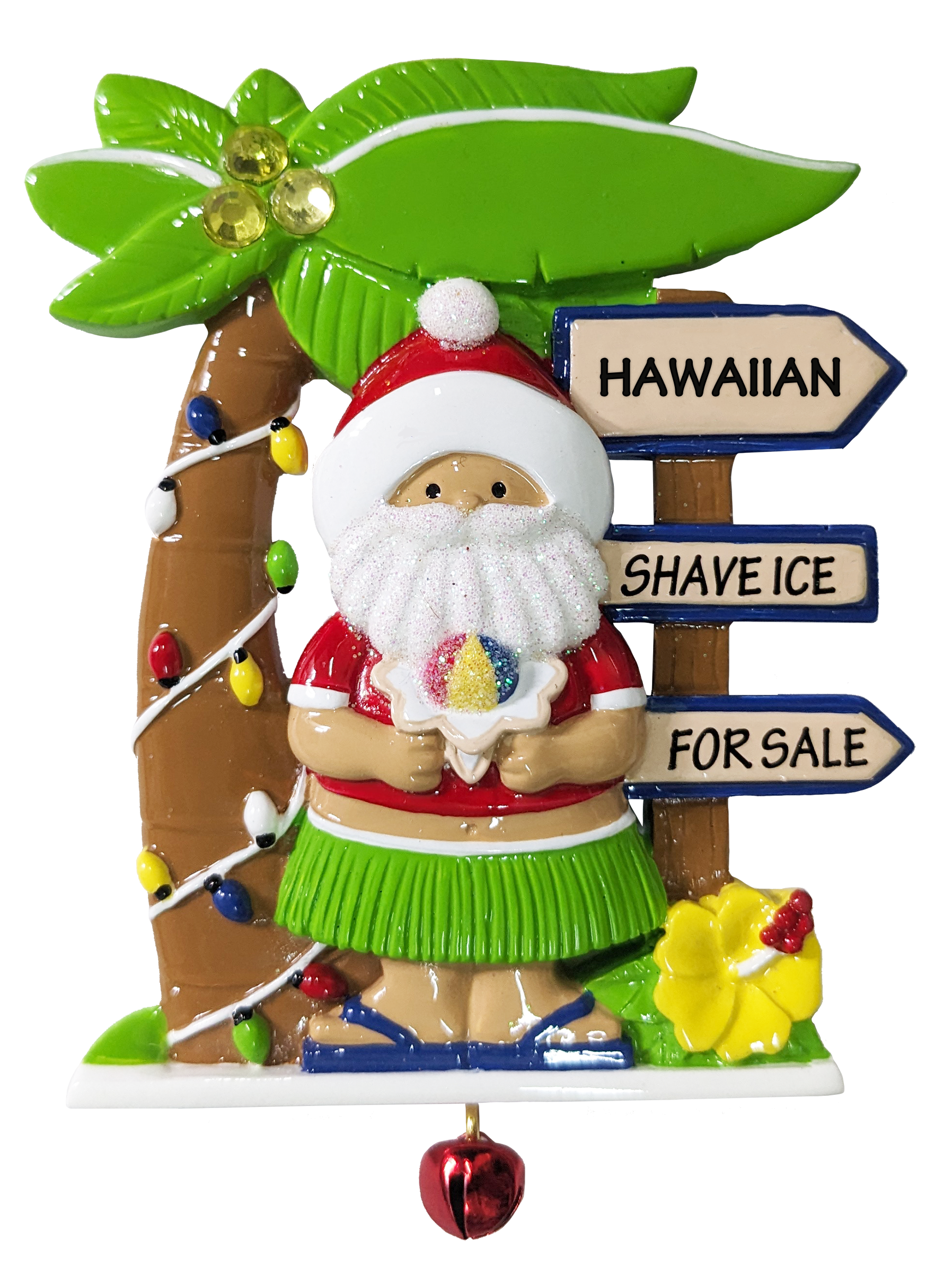 Santa’s got the coolest gig on the island! Dressed in a red tee and grass skirt, this tropical Santa is ready to serve up sweet aloha with a rainbow shave ice in hand. Surrounded by a hibiscus flower, light-wrapped palm tree, and wooden signs pointing to “Hawaiian Shave Ice For Sale,” this ornament brings delicious island flavor to your holiday décor.