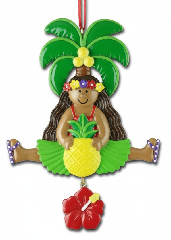 Hula Girl holding a pineapple. Glitter accents the coconut tree.