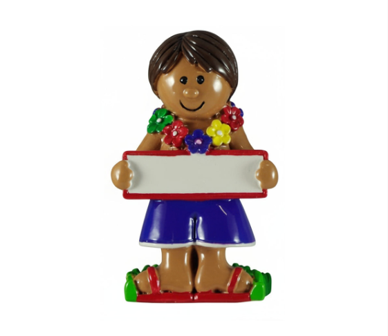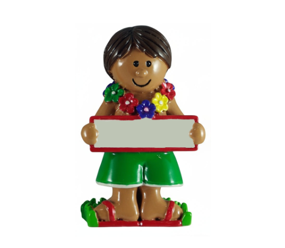 Bring the aloha spirit to your holiday table with our Tropical Boy table topper, featuring a bright red lei, blue shorts, and a blank sign ready for personalization. This festive figure pairs perfectly with our Tropical Hut & Palm Tree Sets (Item LR115) for a complete island family scene.
