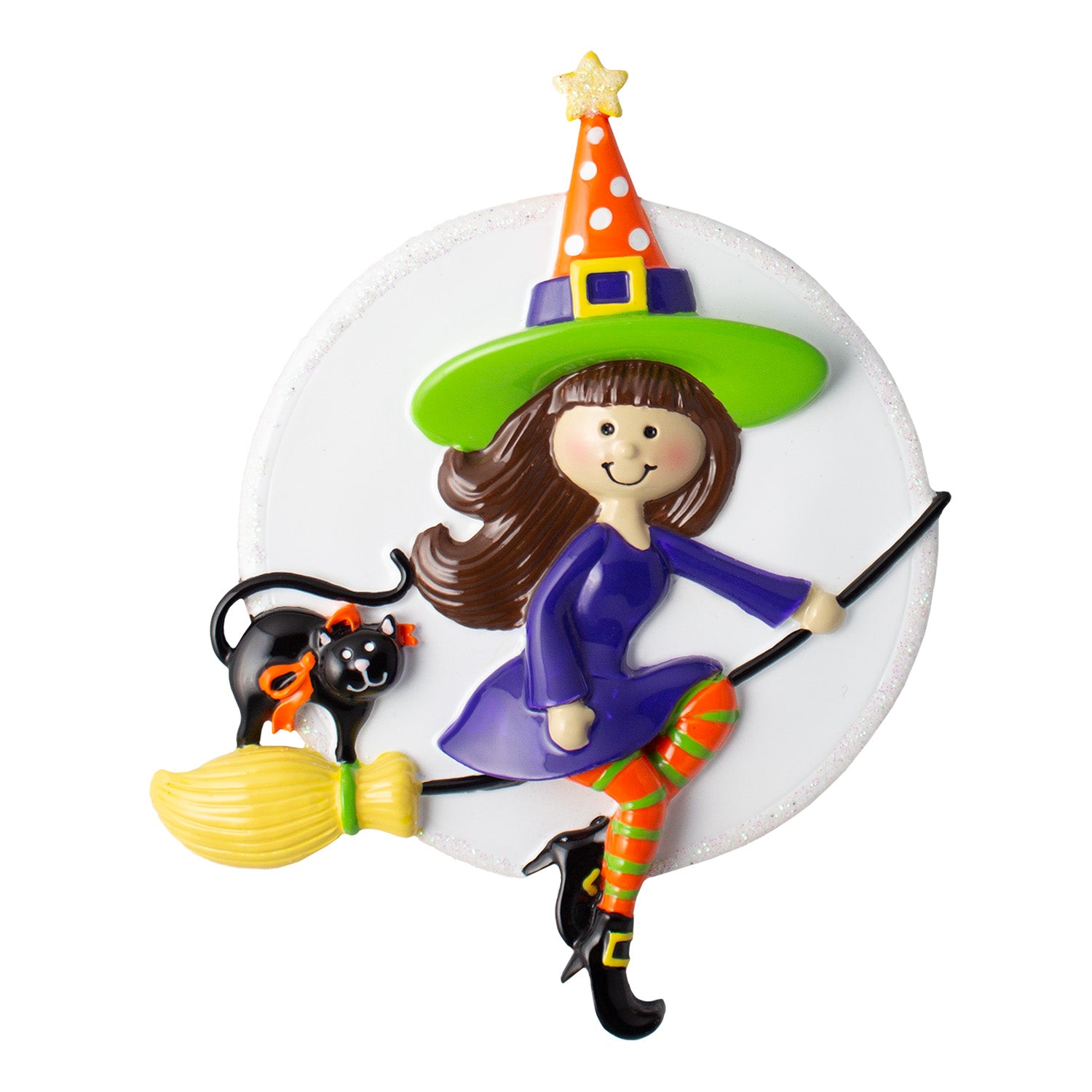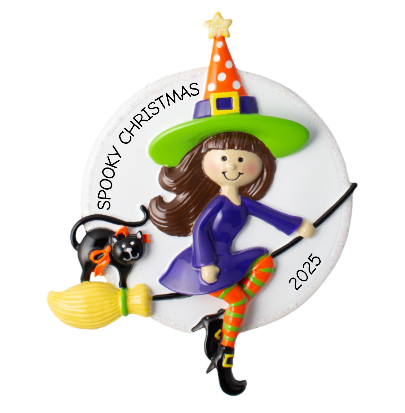 Take your love of magic to new heights with our Flying Witch Ornament, showing a young witch mid-flight with her cat companion. A perfect addition to any spooky tree -a festive gift for Halloween or any witchy soul who dreams of broomstick adventures.