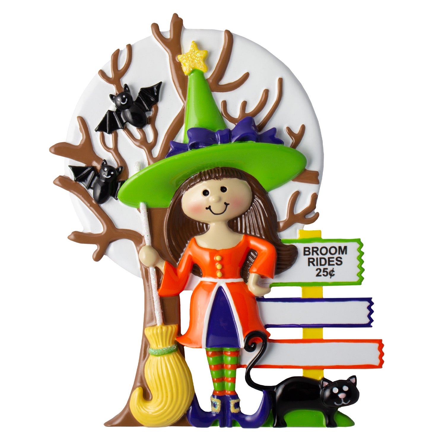 Hop on for magical fun with our Broom Rides Witch Ornament, complete with a spooky signpost, playful bats, and a black cat. A perfect keepsake for Halloween or any witch-loving soul with a sense of adventure.